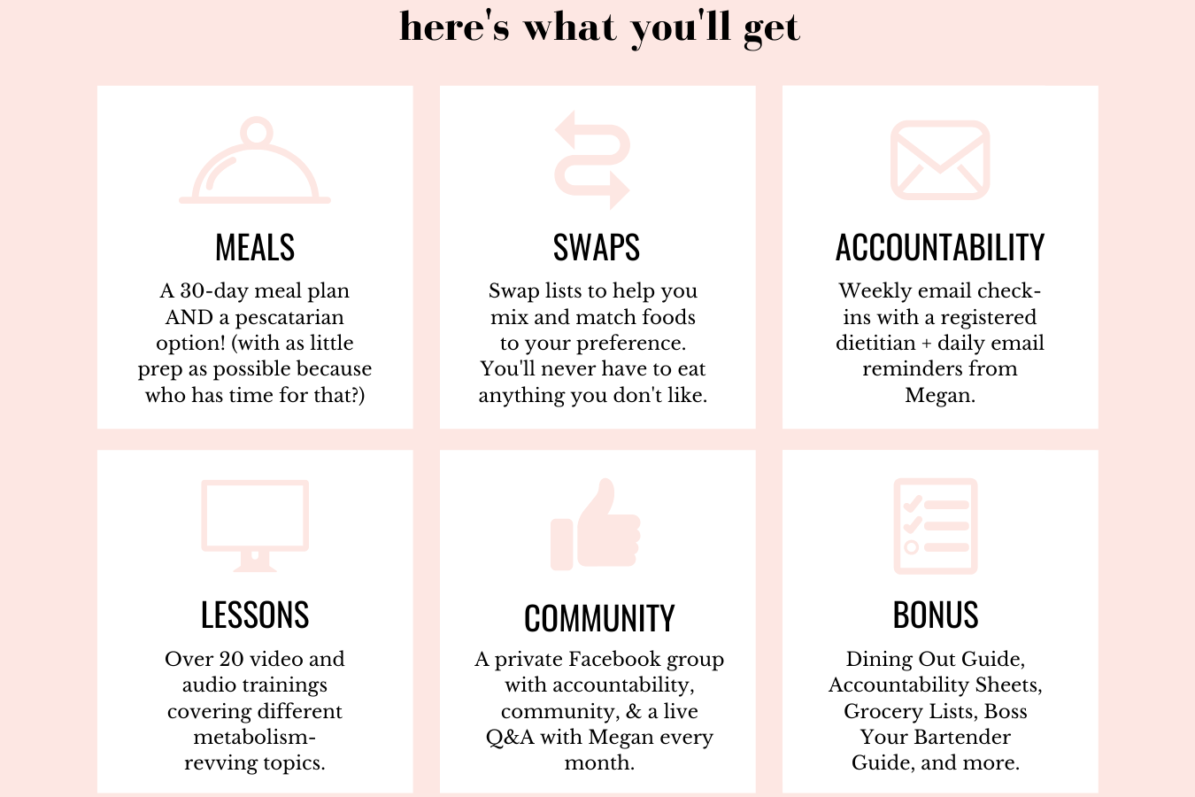 My approach to nutrition and weight loss follows an incredibly simple structure. There is no counting. There is no sacrifice (in other words, you don't have to check your social calendar before signing up). This program involves fueling our bodies and metabolism with real, good food. The focus is on increasing your metabolism to lose weight, not decreasing your food intake. The meal plan is filled with recipes you'll make forever because they're not "diet" recipes. You get to eat your favorite foods, you get to go out to eat, you even get to DRINK ALCOHOL. YEP. By the end of 4 weeks, you'll completely rethink the way you view food.