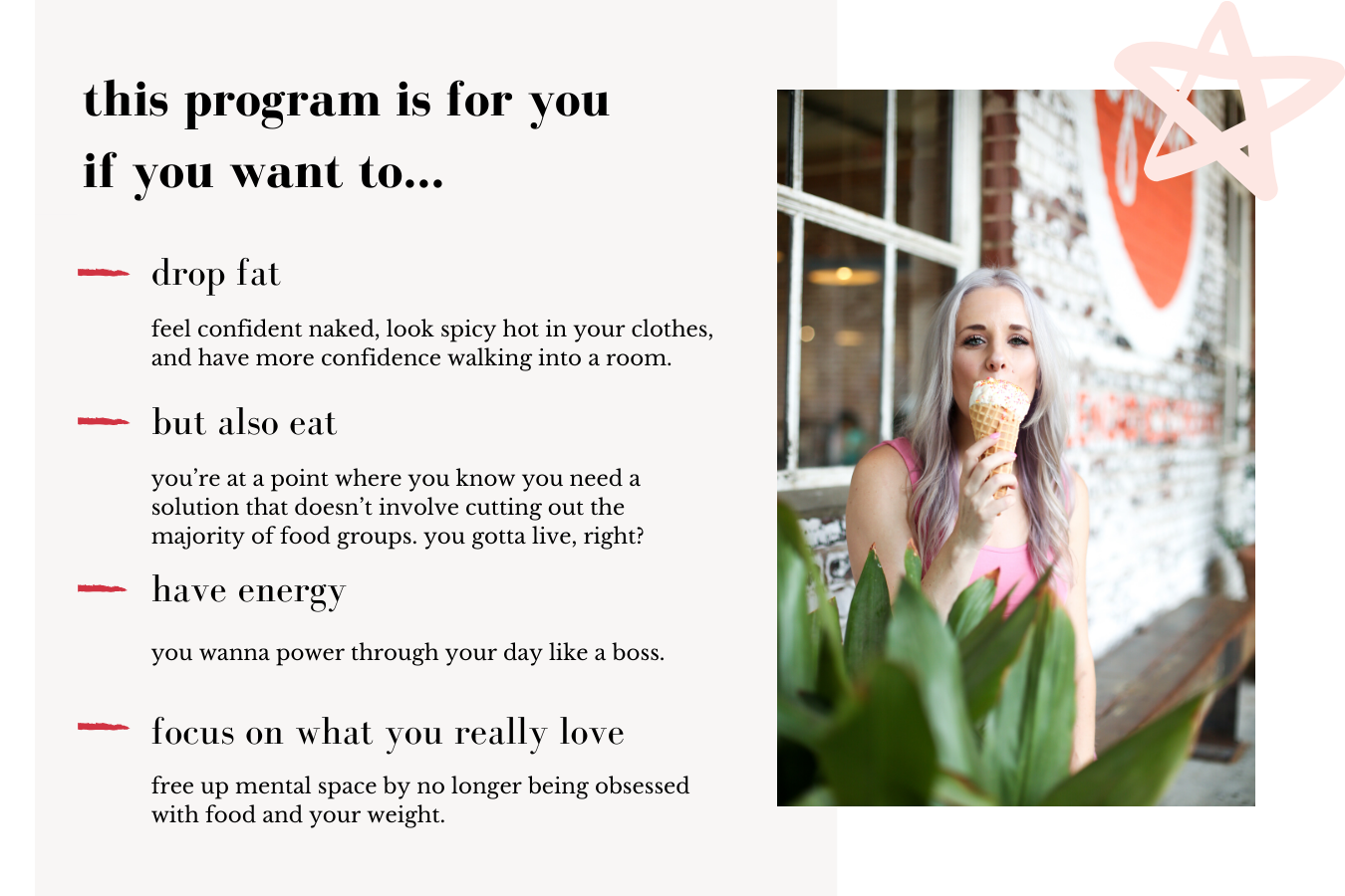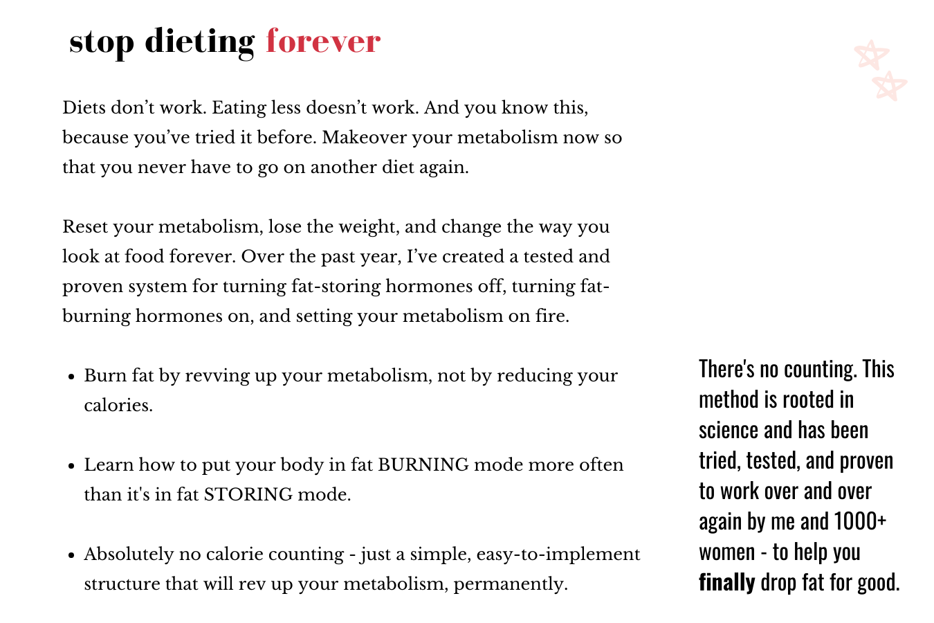 Honestly, most diet programs don't work because they rely on willpower. "Here is the list of things you like to do that you CAN'T do for 30 days." This approach is bullshit, because what happens after the 30 days? You can add those things back in and the weight comes back. Duh. This is a scientifically-backed program that focuses on your biology, not your willpower. I will teach you how to eat in a way that "hacks" your biology and tricks it into burning more fat. I will not teach you how to eat fewer calories so that you end up lowering your metabolic burn (bc - ahem - that's what happens).
