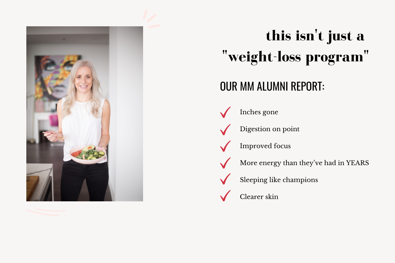 It’s just not. I don’t want you to cancel a thing. I want to help you replace some foods that make you feel like crap, and I want to show how using the simple structure I outline for you in the program can FREE you instead of restrict you. Wanna have a couple glasses of wine? I’ve got you. Going out to a Mexican restaurant with girlfriends? I’ll help you figure it out without throwing yourself off. You can totally eat like a normal person and not be “weird.” Unless you wanna be weird. It’s up to you. This is a “you do you” plan. I’m just here to give you a simple structure and empower you to get the results you want.