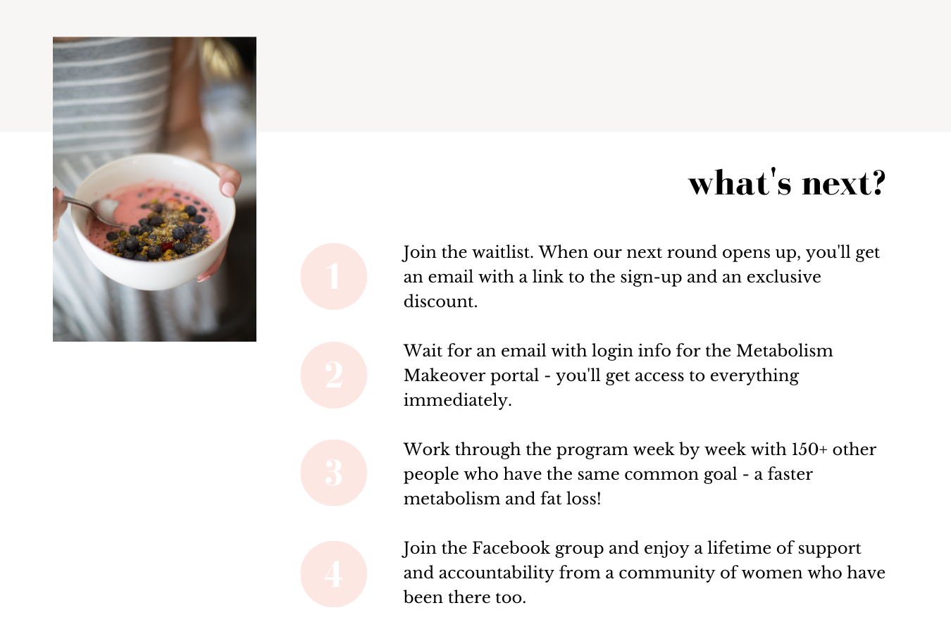 Metabolism Makeover Momentum (M3) is our MM continuation program. When you purchase MM, you will automatically be enrolled in M3 at the end of the 30 days. This first month is 100% free! After that (if you do nothing), you will automatically be billed for $59 once a month. But you can cancel at any time. Why do we have this? Because research shows you really need at least 3 months of accountability to make a program really stick. Don't worry - we'll give you all the deets about what's included before your 30 days are up.