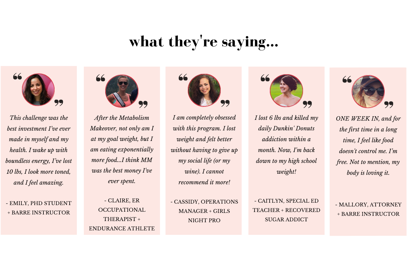You can expect to completely change the way you think about food. You can expect to ditch food anxiety and start living your life again. Food is a big part of our lives, so focusing on it and stressing over it takes a LOT of energy. I want you to spend your energy on other things. Things you REALLY love. And aside from that, participants report better sleep, more energy, clearer skin, less stress, and improved digestion. I've also had people go off blood sugar, cholesterol, and prescription acid-indigestion meds after meeting with their doctor following completing the program.